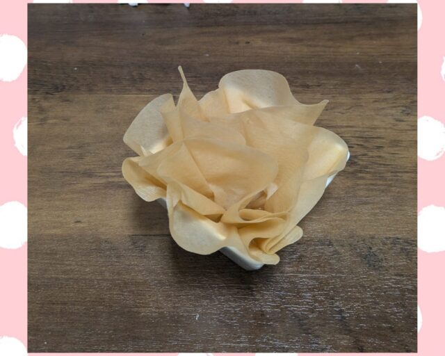 コーヒーフィルターとゴムでミニハリセンをつくり、広げてから水の入った容器にいれると…