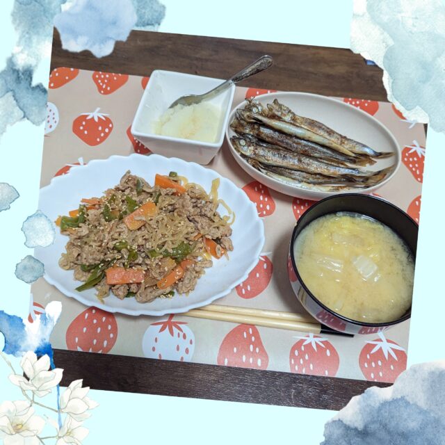 チャプチェと味噌汁くらいでよいかと思ってたけど、お肉買いに行ったらししゃもが半額で…