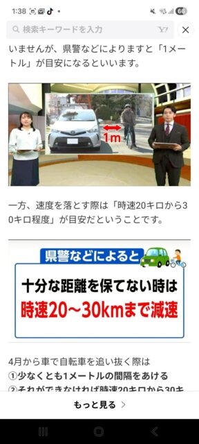 自転車を追い抜く際の「十分な間隔」について、道路交通法に具体的な数字は明記されていませんが、県警などによりますと「1メートル」が目安になるといいます。